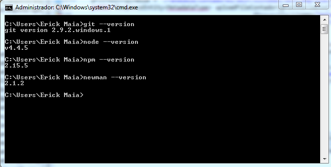 Compare seu cmd com a imagem a seguir para confirmar o processo de instalação (use o comando newman --version para confirmar que a instalação foi bem sucedida):